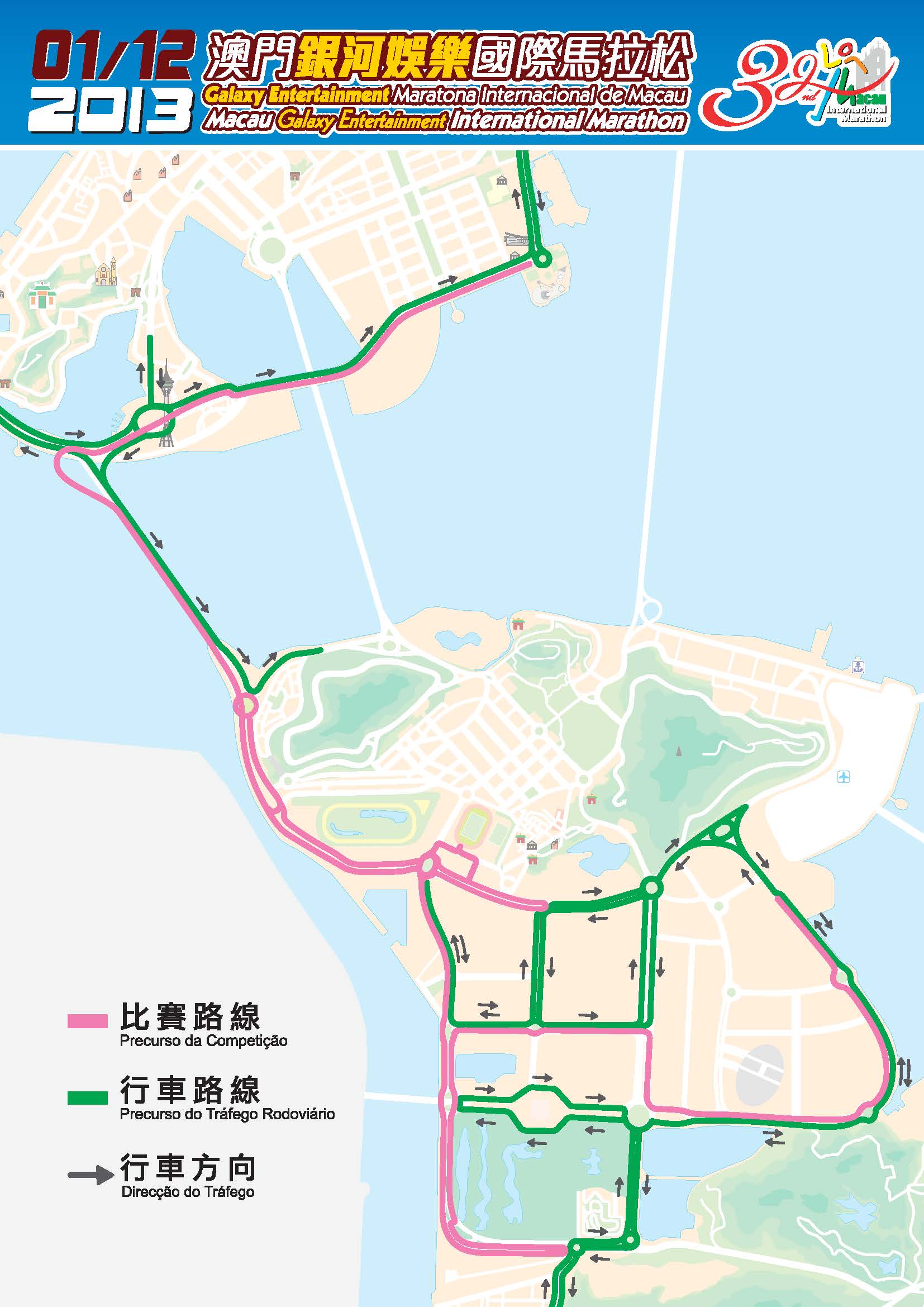 A Organização coloca previamente as placas de indicação de condicionamentos de trânsito nas vias afectadas e chama mais uma vez a atenção do público para as alterações introduzidas nas vias públicas, respeitando as sinalizações de trânsito provisórias e as instruções dos agentes do Departamento de Trânsito. Para mais informações da Galaxy Entertainment Maratona Internacional de Macau 2013, é favor consultar o website oficial www.macaumarathon.com.