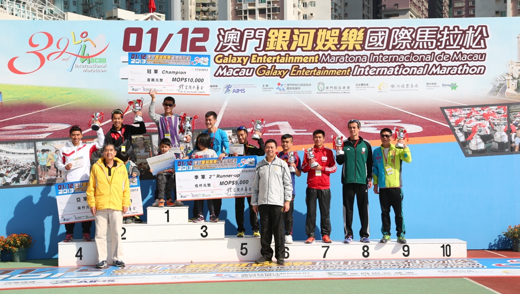Realizou-se ontem, dia 1, a “Galaxy Entertainment Maratona Internacional de Macau de 2013”, com sucesso, uma organização conjunta entre o Instituto do Desporto e a Associação de Atletismo de Macau, e como patrocinador principal a Galaxy Entertainment Group, onde participaram cerca de 6000 atletas vindos de 47 países/regiões. Na classificação geral, foi campeão, o atleta convidado Julius Kiplimo Maisei na categoria masculina que com o tempo de 2:12:43, para além do prémio pecuniário, conseguiu também o Prémio Recorde e o Bónus, tendo ganho o montante total de 35 mil dólares americanos. Na categoria feminina, a Norte Coreana Mi Gyong Kim, terminou a prova em 2:36:32, tendo ambos ganho o prémio pecuniário de 20 mil dólares americanos. Foram vencedores na categoria de atletas de Macau, Chan Chong Ip nos masculinos, e Hoi Long com o tempo de 3:02:21 bateu o record de Macau nos femininos, tendo ganho no total de 40 mil patacas.