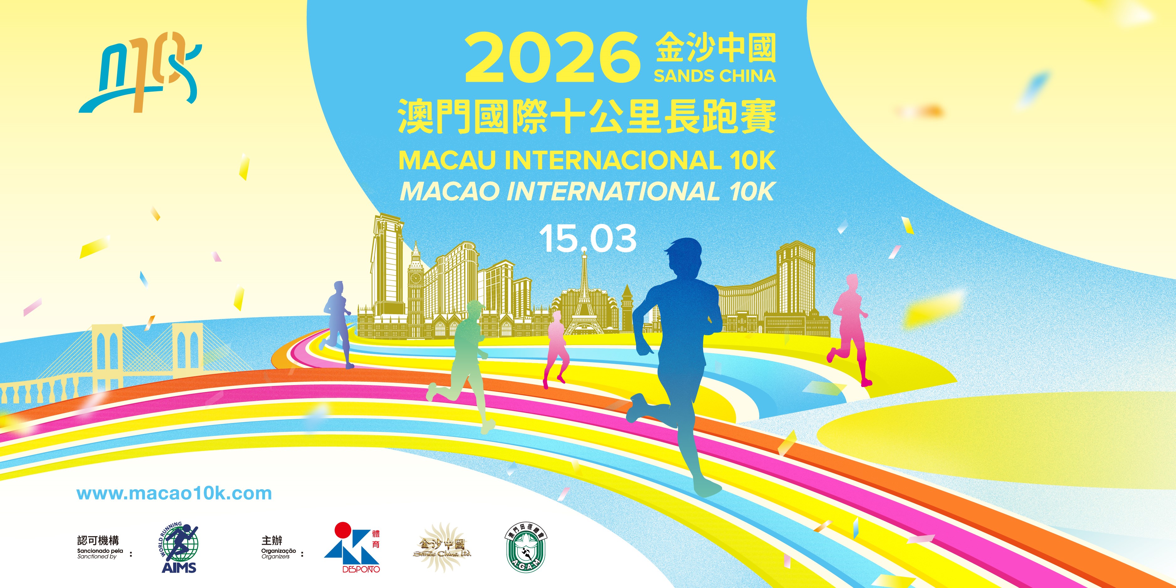 Organizada pelo Instituto de Desporto, pela Sands China Ltd. e pela Associação Geral de Atletismo de Macau (AGAM), a 2026 Sands China Macau Internacional 10K terá lugar no dia 15 de Março (domingo). O Evento consiste em duas modalidades, designadamente, 10K e Fun Run. A prova de 10K terá início às 07H00, e a prova de Fun Run às 07H40, com partida na Praça do Lago Sai Van e chegada no Estádio do Centro Desportivo Olímpico.
