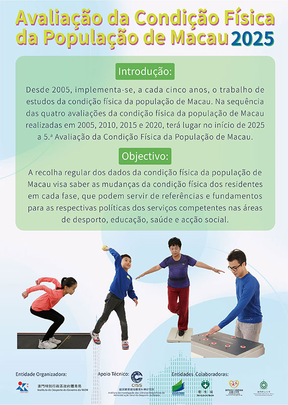 Para dar continuidade às quatro avaliações acima mencionadas, a 5.ª Avaliação da Condição Física da População de Macau em 2025 continua a ser coordenada pelo Instituto do Desporto, em colaboração com a Direcção dos Serviços de Educação e de Desenvolvimento da Juventude, os Serviços de Saúde, o Instituto de Acção Social e a Universidade Politécnica de Macau, sendo o apoio técnico prestado pelo Instituto da Investigação das Ciências Desportivas da Administração Geral do Desporto do Estado.
