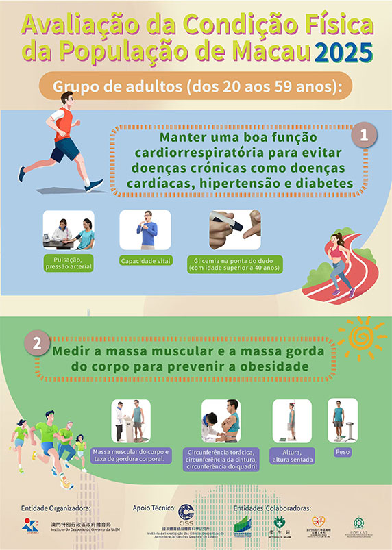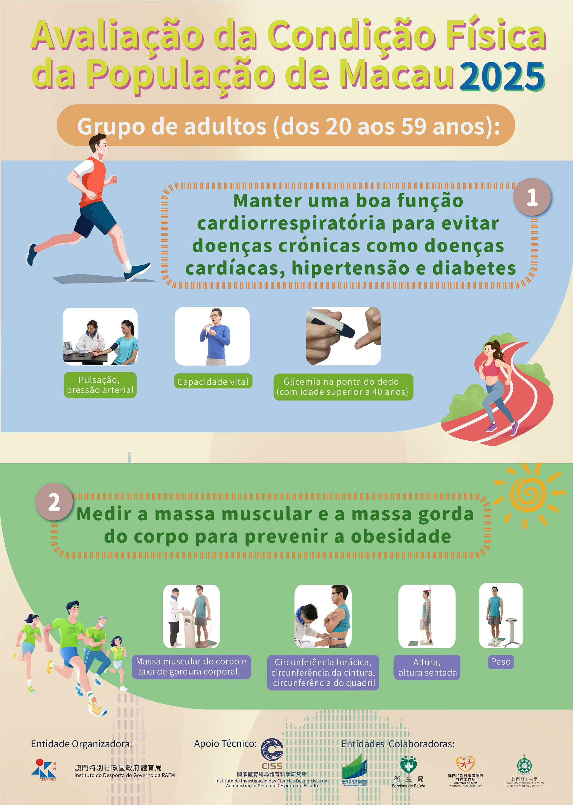O grupo de adultos, referido na Avaliação da Condição Física da População de Macau 2025, envolve os trabalhadores de Macau com idade compreendida entre os 20 e os 59 anos. Os adultos são a principal força da sociedade, precisam de assumir as responsabilidades complexas da sociedade, e a manutenção da boa condição da saúde física é uma base para adaptar e assumir a ocupação no trabalho. Atravez da Avaliação da Condição Física, podemos orientar os adultos para a prática de exercício físico para manter uma boa condição física.