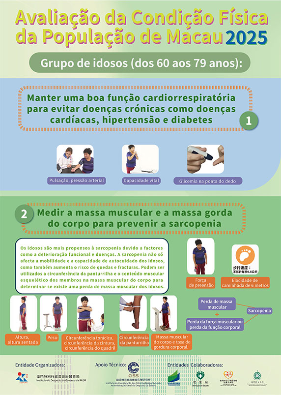 O grupo de idosos, referido na Avaliação da Condição Física da População de Macau 2025, envolve os cidadãos de Macau com idade compreendida entre os 60 e os 79 anos. À medida que se desenvolve a tecnologia, a estrutura da população está a mudar, a percentagem dos idosos na sociedade está relativamente a aumentar. Por isso, o estado de saúde dos idosos e a qualidade da vida vão influenciar as despesas médicas da sociedade, assim torna-se cada vez mais importante realizar bem os trabalhos de planeamento para a melhoria da saúde dos idosos. Através dos testes da condição física, podemos conhecer a condicao fisica dos idodos e orientar os idosos para participarem em exercicio fisico.