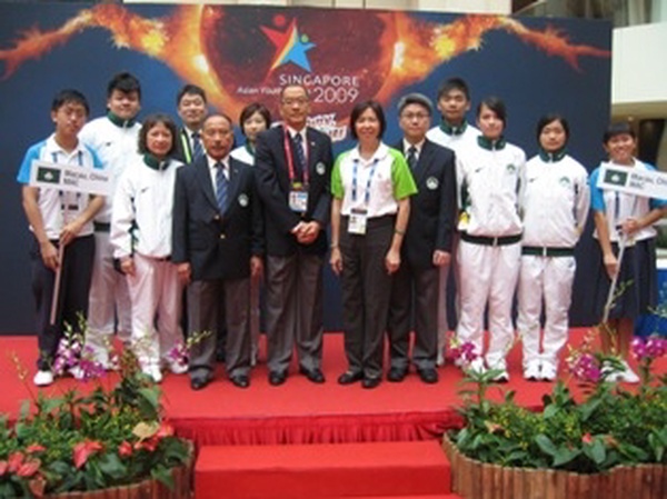 參加2009年6月29日至7月7日在新加坡舉行的「第一屆亞洲青年運動會」的澳門特區體育代表團,於昨天(29日)上午十時正出席亞洲青年運動會組委會安排的代表團歡迎儀式升旗禮。澳門特區體育代表團在昨天(29日)上午十時正,出席了在代表團住宿酒店瑞士史丹福酒店三樓平台舉行的升旗禮,與澳門同一時間進行升旗禮的還有來自巴林、緬甸、中華台北和越南四個國家和地區的代表團,升旗儀式後澳門特區體育代表團副團長郭寶泉與新加坡第一屆亞洲青年運動會運動員村村長岑金鳯女士進行紀念品交換。