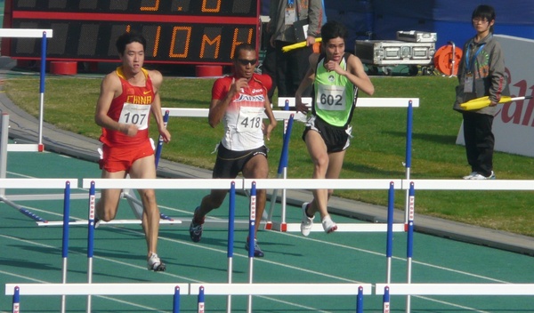 容儉輝(綠衫)與劉翔同場競逐百一米欄