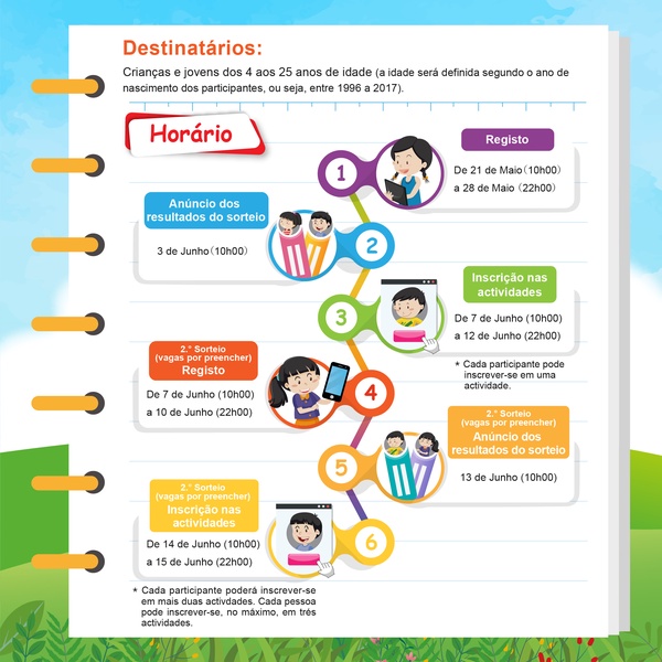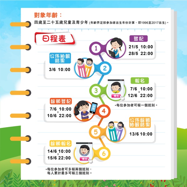 暑期活動的報名流程是“登記、抽籤、報名完全網上進行”。5月21日上午10時起,第一步驟“登記”正式啟動,歡迎符合年齡的兒童及青少年在截止日期5月28日晚上10時前登記。每位參加者報名期可報一個班別,餘額報名期可多報兩個班別,每人累計共可報三個班別。主辦單位將分別於5月21日在青年試館及5月22日在親職教育中心舉辦網上報名講解會(講解會報名連結 www.summeractivity.gov.mo/sasmember/signup),歡迎市民出席。