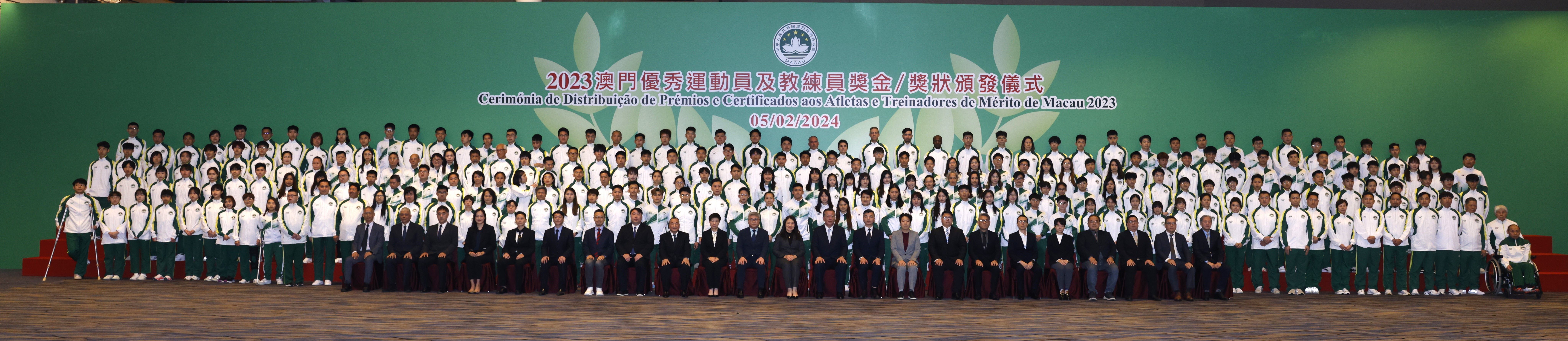 A “Cerimónia de Distribuição de Prémios e Certificados aos Atletas e Treinadores de Mérito de Macau 2023” presidida pela Chefe do Gabinete da Secretária para os Assuntos Sociais e Cultura Ho Ioc San, em representação da Secretária para os Assuntos Sociais e Cultura do Governo da RAEM, realizou-se hoje (dia 5), pelas 19:30, para felicitar os atletas e treinadores que obtiveram excelentes resultados desportivos nos eventos desportivos de 2023.