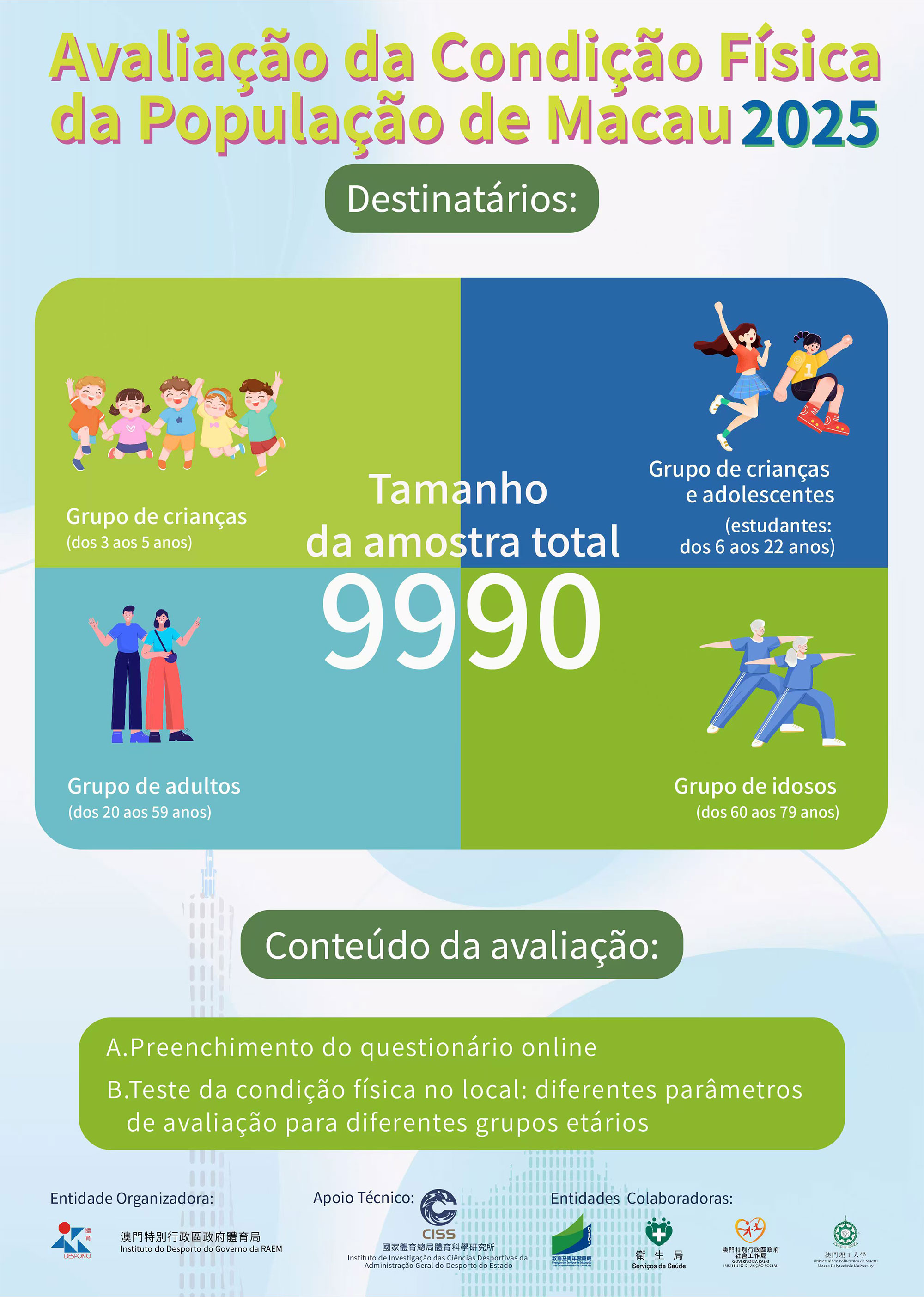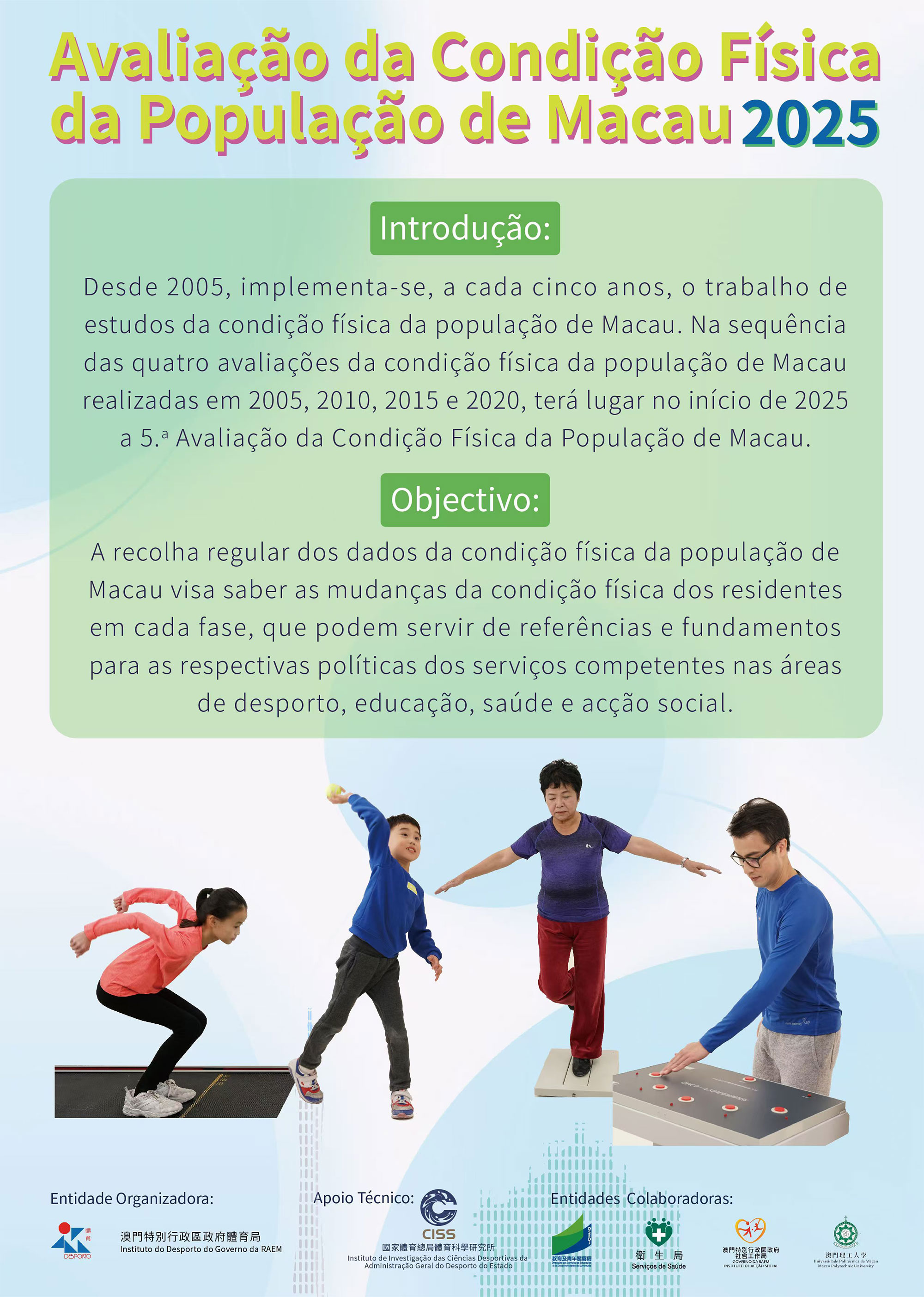 O Governo da Região Administrativa Especial de Macau começou a implementar, desde 2005, o trabalho de estudo da avaliação da condição física da população de Macau, tomando como referência o Sistema Nacional dos Critérios de Teste e Avaliação da Condição Física dos Nacionais, e organizou, em 2005, 2010 e 2015, três avaliações da condição física da população de Macau com idades compreendidas entre os 3 e os 69 anos. Ao realizar a 4.ª Avaliação da Condição Física da População de Macau em 2020, a faixa etária para a avaliação foi alargada devido ao envelhecimento da população, ou seja, os destinatários da avaliação passaram a ser residentes de Macau com idades compreendidas entre os 3 e os 79 anos. O objectivo é recolher regularmente os dados da condição física dos residentes de Macau para conhecer as mudanças da condição física da população em cada fase, a fim de oferecer referências políticas aos serviços competentes nas áreas do desporto, da educação, da saúde e da acção social, estimulando o trabalho de promoção da saúde, de modo a melhorar a condição física da população.