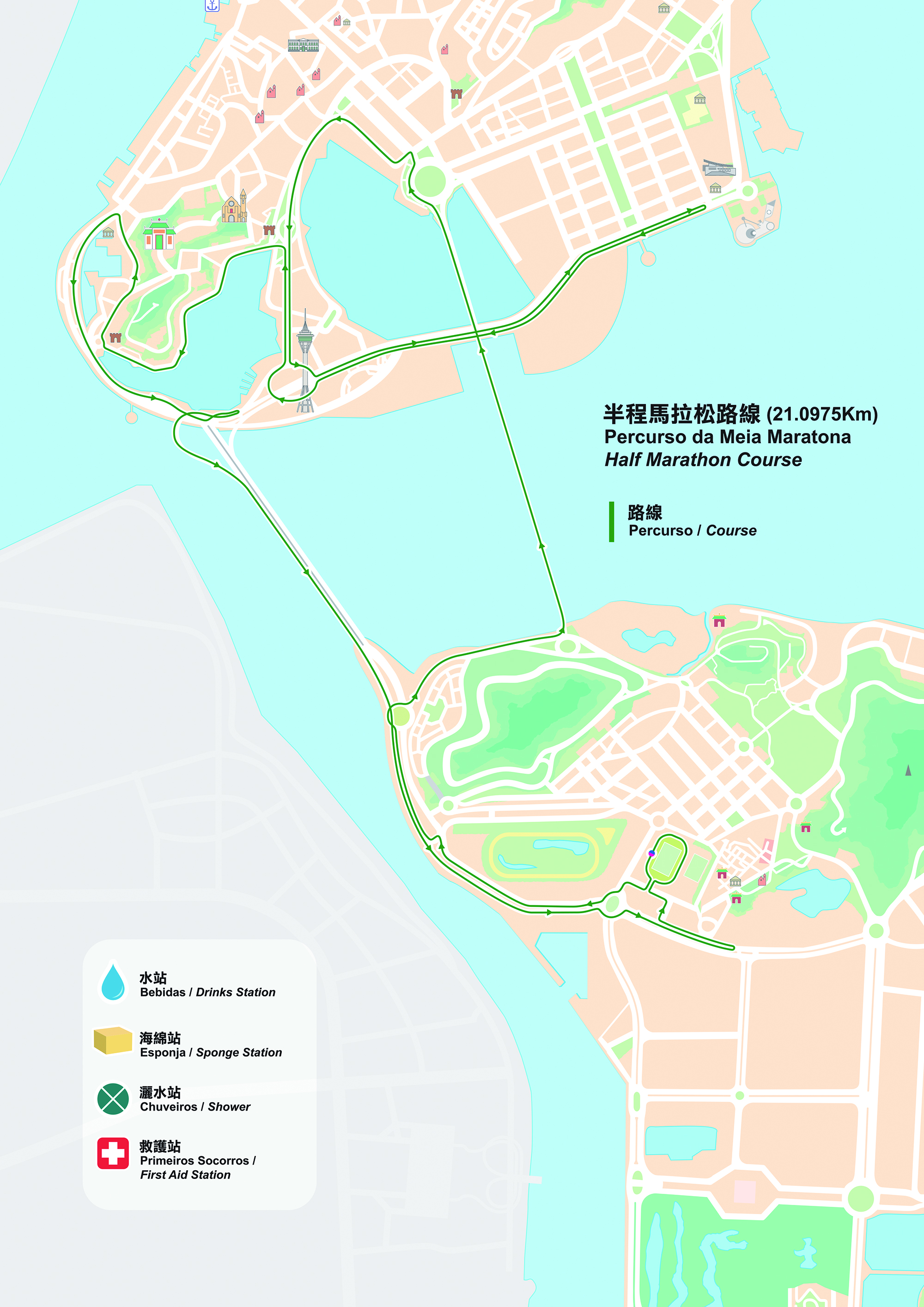 賽道方面,全馬及半馬都會途經南灣、雅文湖畔及媽閣廟,並會跑進嘉樂庇總督大橋。