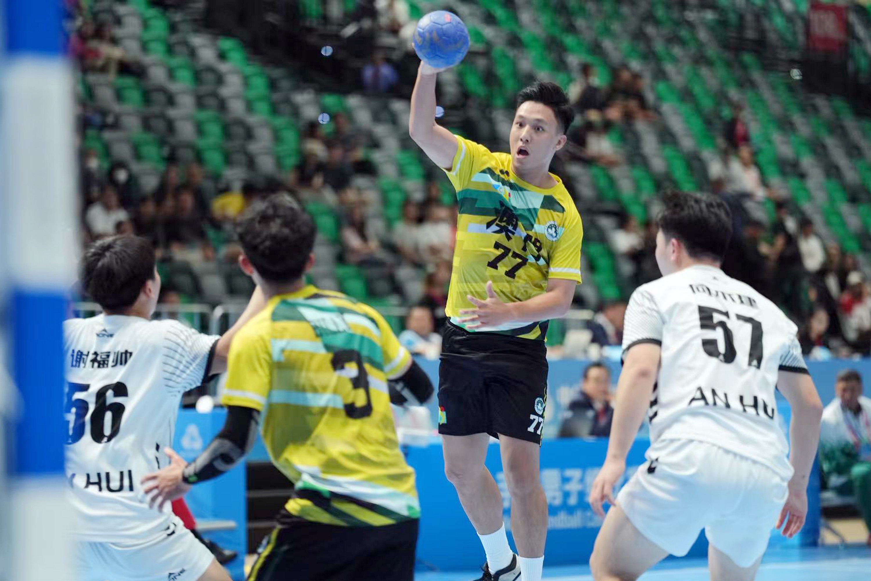 在香港賽區進行的男子手球小組賽,澳門隊第三輪面對香港,至截稿前仍在比賽中。