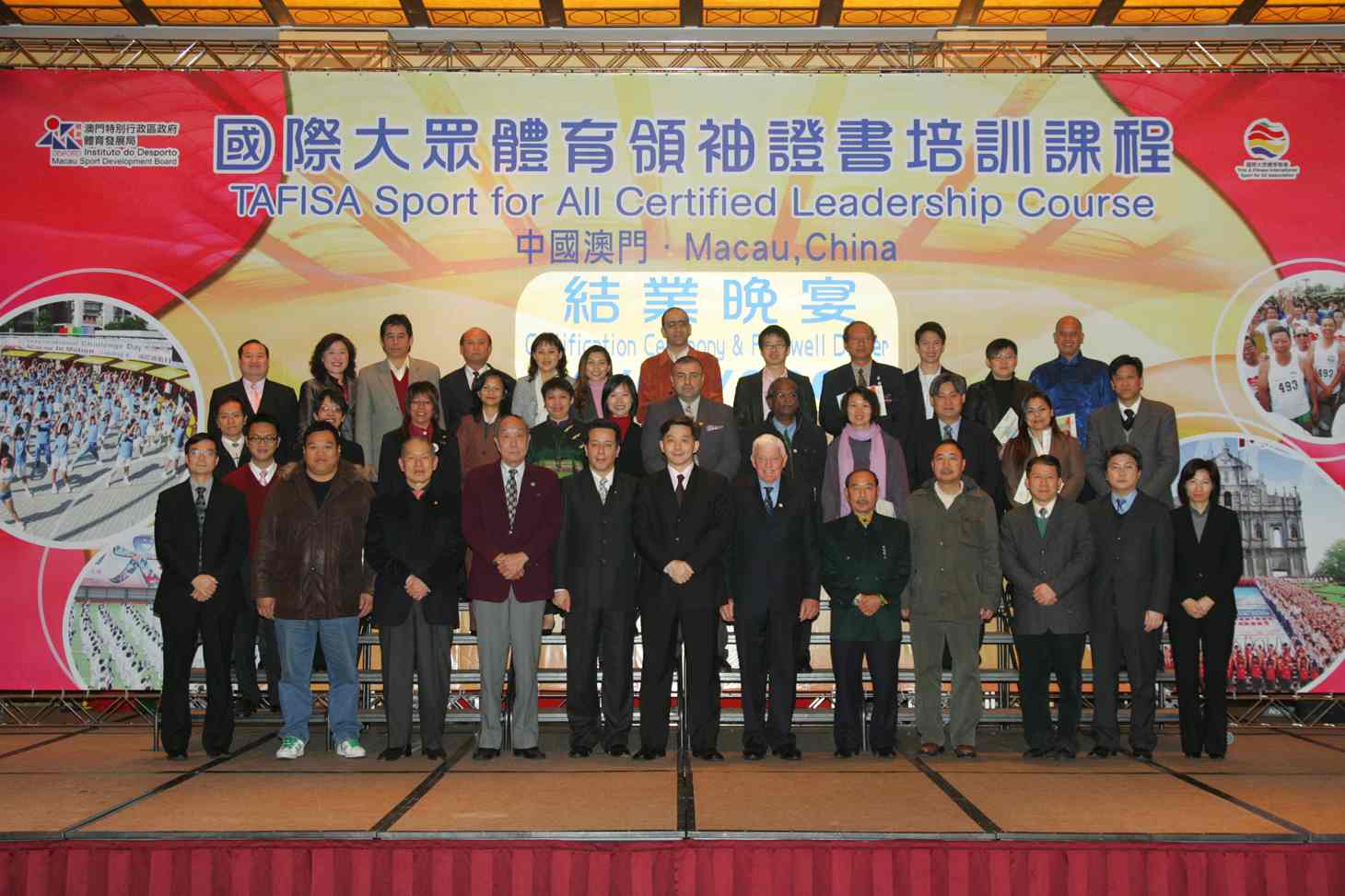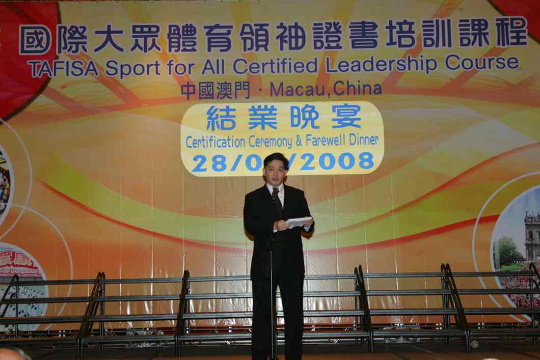 晚宴開始前,主辦單位先就澳門在大眾體育方面的發展作介紹,接著,分別由體育發展局代局長黃有力及國際大眾體育聯會財政兼亞洲大眾聯會秘書長狄拜恩致詞,黃有力感謝各學員的參與,勉勵各人將學到的知識在當地傳承,使大眾體育事業可以推展得更好,並讓各地的巿民生活質素都可以獲得進一步的提升,而狄拜恩則代表國際大眾體育聯會感謝澳門在主辦這次課程所付出的努力,並肯定整個課程的成果令人鼓舞,同時表示未來必將加強與澳門在大眾體育事業上各方面的合作。之後由黃有力及狄拜恩向各合格學員頒發證書,儀式後馬上開始歡送晚宴,學員們雖然在澳門只逗留了短短數天,然而各人之間已建立了深厚的友誼,離別在即,各人均表現出不捨之情,在宴會上各學員即席合唱一曲,並承諾今後將繼續保持聯絡,並將加強彼此的聯繫與合作。而各海外學員亦將於今天分批離澳。