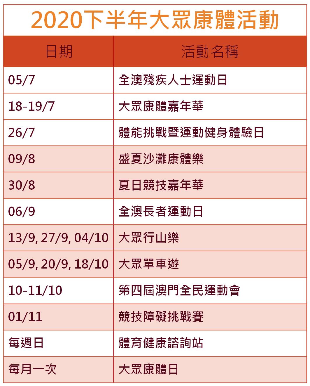 下半年計劃舉辦的大眾康體活動內容豐富(詳見附表),除了原有的年度計劃活動,當中也不乏全新主題活動;此外,體育局已開通“澳門大眾體育動向”Facebook專頁,各項大眾體育消息將陸續更新至此專頁,市民可從中了解更多上述大眾康體活動詳情及參加方法、其他大眾體育活動的最新消息、體育學校資訊及體育運動小知識等,並參與線上互動遊戲。歡迎市民到Facebook搜尋並關注“澳門大眾體育動向”專頁,獲取最新活動資訊,踴躍參與體育運動鍛鍊。